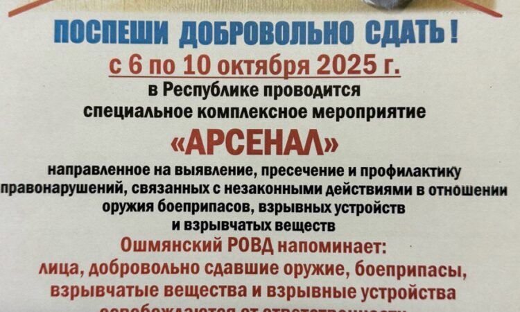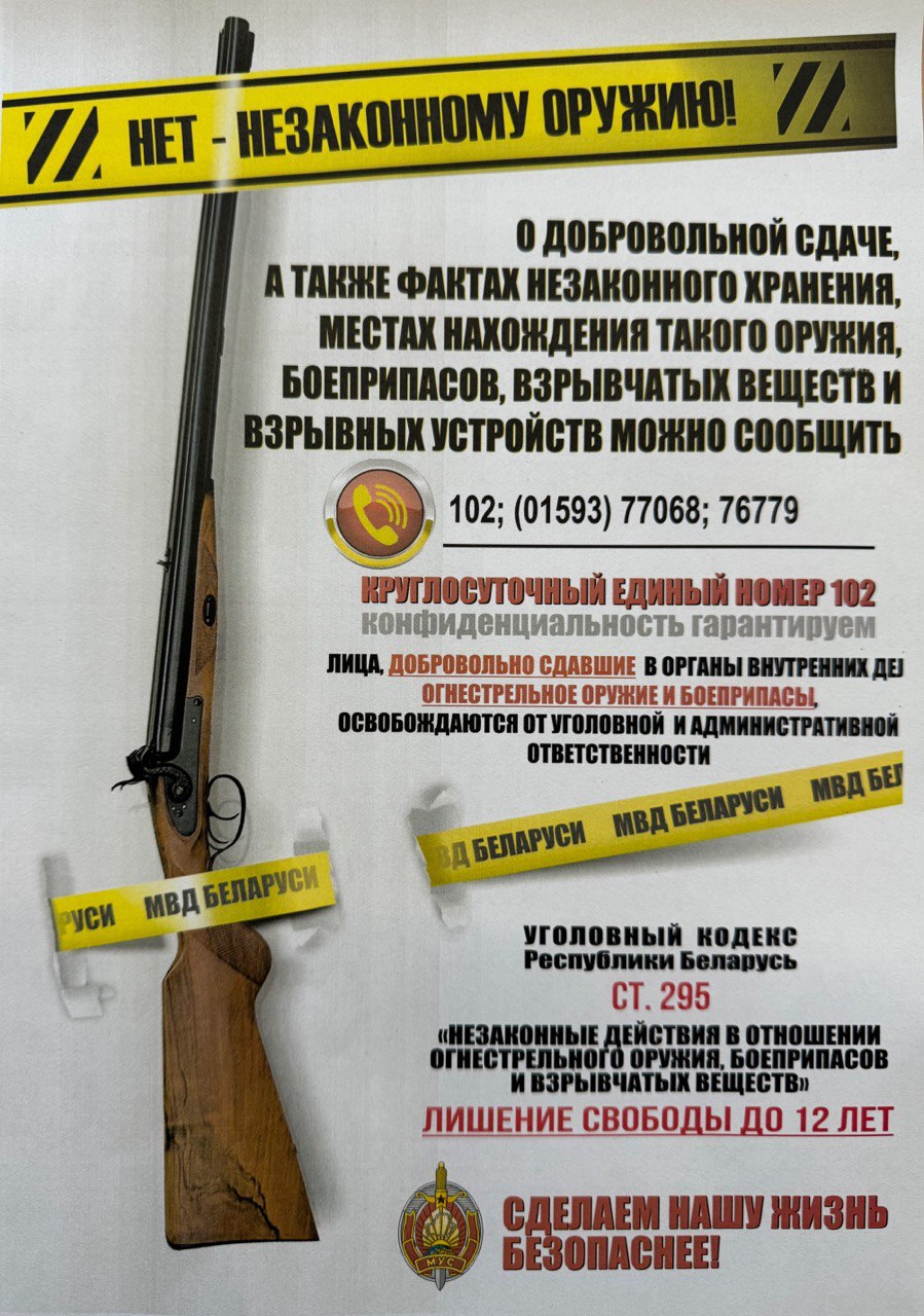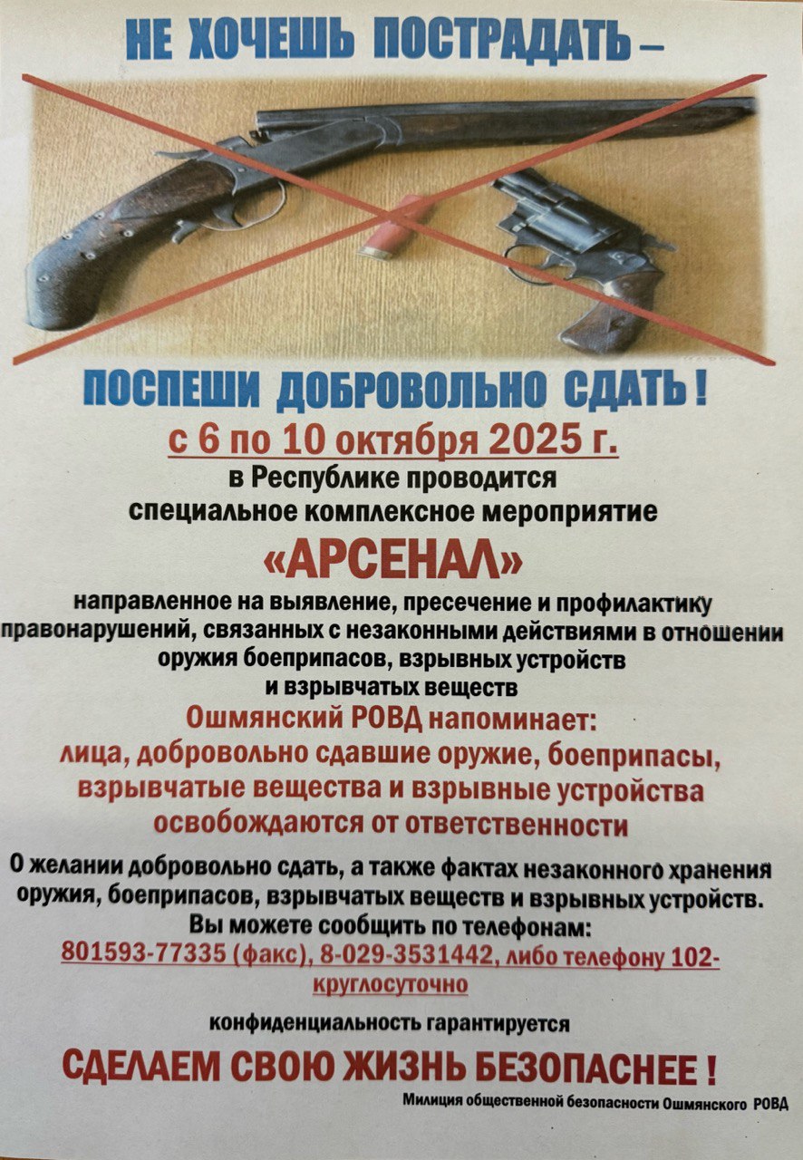 С 6 по 10 октября 2025 г. в Республике проводится специальное комплексное мероприятие «АРСЕНАЛ» направленное на выявление, пресечение и профилактику правонарушений, связанных с незаконными действиями в отношении оружия боеприпасов, взрывных устройств и взрывчатых веществ Ошмянский РОВД напоминает: лица, добровольно сдавшие оружие, боеприпасы, взрывчатые вещества и взрывные устройства освобождаются от ответственности О желании добровольно сдать, а также фактах незаконного хранения оружия, боеприпасов, взрывчатых веществ и взрывных устройств. Вы можете сообщить по телефонам: 801593-77335 (факс), 8-029-3531442, либо телефону 102-круглосуточно конфиденциальность гарантируется.